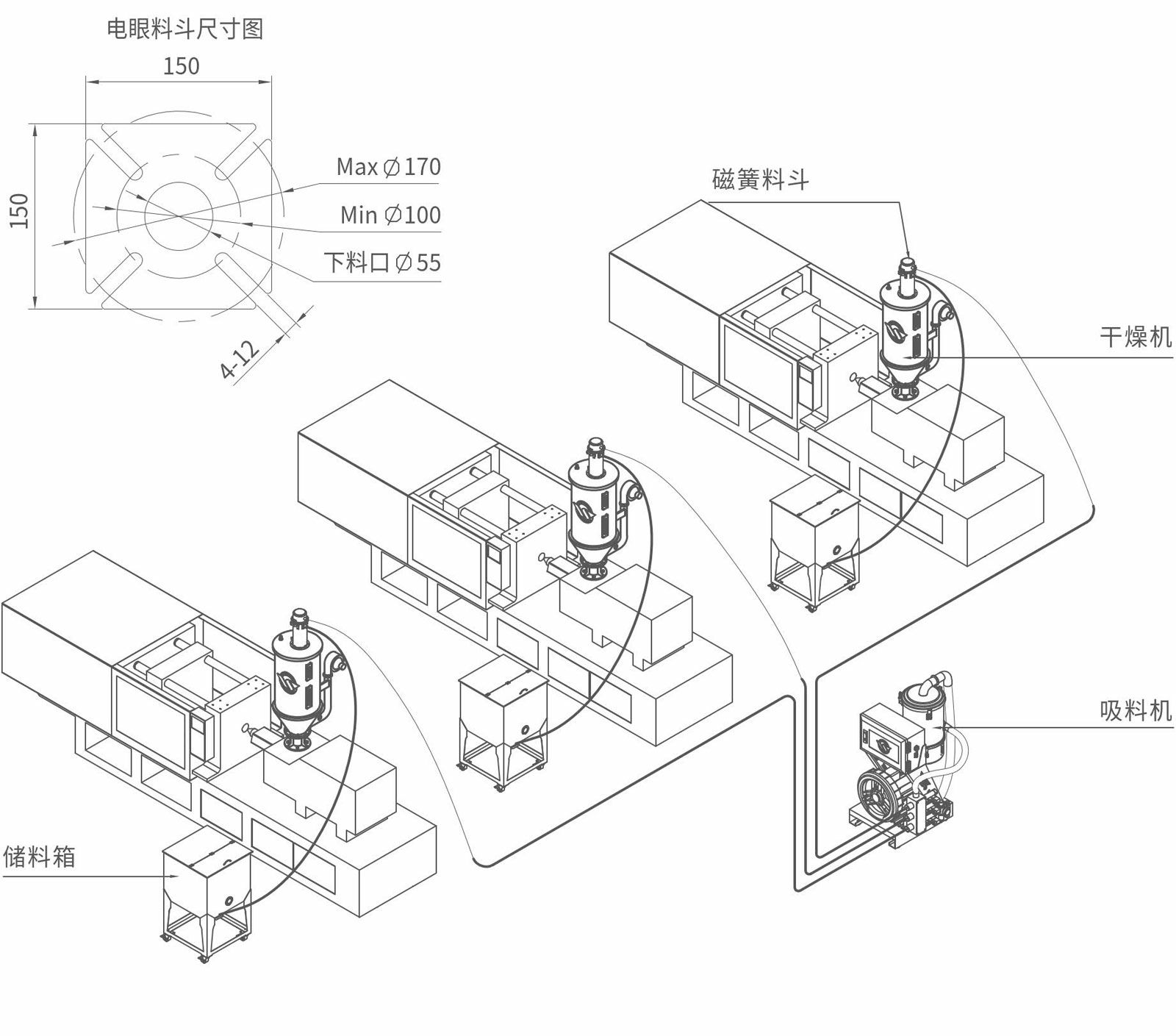 性能特点一机拖多斗,节省设备配置,节约空间,可根据实际使用情况选配真空料斗和电眼料斗。尤其适用干燥、供料一体化系统,简化系统结构,提高使用效率,方便操作。全自动电脑操作程序。集成控制,操作、安装、调试方便。维修保养方便、快捷。