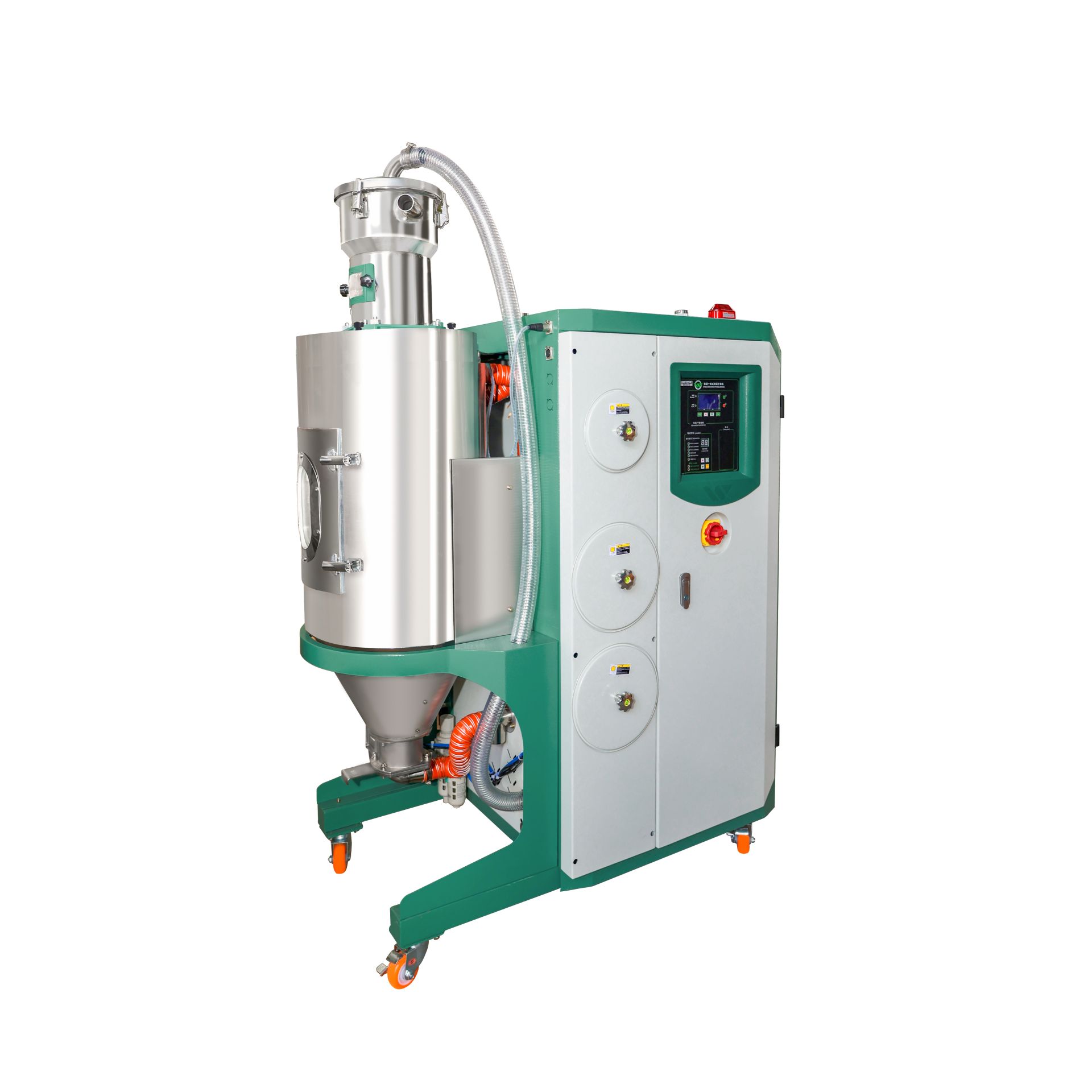 性能特点本机台集除湿、干燥、送料三种功能于一体。送料标配为一拖二:一个磁簧料斗、一个电眼料斗。可选配为一拖三:一个磁簧料斗、二个电眼料斗。最多可选配为一拖四:一个磁簧料斗、三个电眼料斗。干燥除湿控制采用微电脑控制,P.1.D.控温。液晶显示、按钮操作,操作界面简洁易懂。采用双冷却器结构,确保更低的回风温度,蜂巢可达到-40℃以下露点,在配置增强冷冻水状态下更可达到-50℃甚至更低的露点。操作界面简洁易懂,故障问题文字显示一目了然。欧化式干燥料桶设计,保温性能强,有效防止热能散失,提高干燥效率。密闭回路的送料系统,可避免干燥后的原料因接触外界空气而再度回潮。送料系统标配有截料阀装置,确保每次送料完成后料管中无残留原料。一体式的设计占地面积小、移动方便,可任意更换机台使用。可选配PLC人机界面控制(送料最多可选配一拖五)。可选配装露点检测仪。